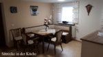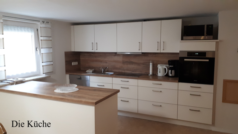 Eine große Wohnküche mit Sitzmöglichkeit für 6 Personen. Die Küche ist vollständig ausgestattet mit Kühlschrank, Spülmaschine, Elektroherd, Kaffeekocher, und Mikrowelle.
