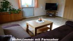 Ein 40 m² großes Wohnzimmer mit Fernseher und Sitzgelegenheit.
